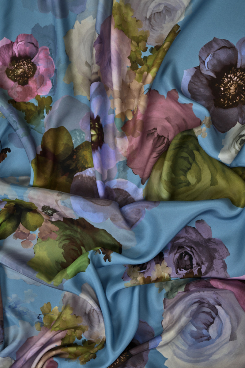 Italian 100% silk satin with a motif of large, pastel flowers on a blue background. Delicate large pattern made on the matte side, the largest flower is 20cm*20cm. Floral motifs in calm colors go from more intense colors from one edge of the fabric to pale ones on the other edge - we recommend sewing circumferentially. The fabric is flowing, soft, non-elastic and very pleasant to the touch. It is perfect for airy dresses, skirts, as well as blouses and tunics.