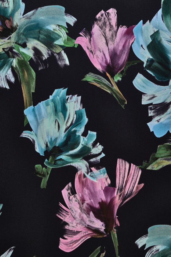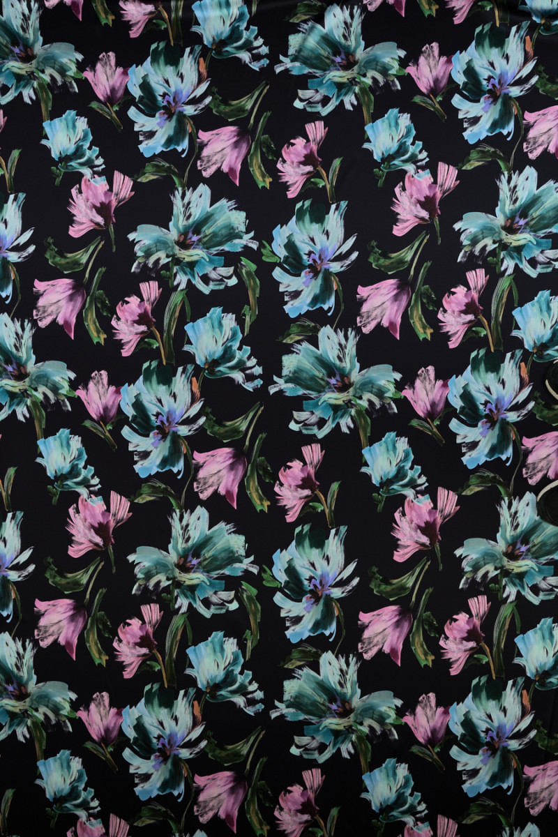 Italian silk satin with the addition of elastane with a motif of large, brush-painted flowers on a very dark, navy blue background. Dense pattern made in shades of turquoise and heather pink, the largest flower measures 23 cm * 27 cm. The fabric is flowing, soft, elastic and beautifully shiny, which gives it a unique elegance. It is perfect for airy dresses, skirts, as well as blouses and shirts.