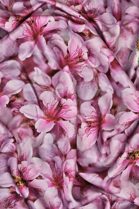 Italian 100% silk twill fabric with a motif of pink flowers and insects. A clear pattern that looks like a photograph with regularly repeating butterflies and wasps. The fabric is light, opaque, non-elastic, finished with a delicate shine. An interesting proposition from which you can conjure up a shirt, dress, skirt or blouse.