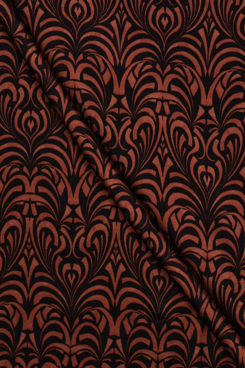 Italian silk satin with the addition of elastane with oriental motifs in reddish-orange on a dark navy blue background. A very dense and regular pattern in beautiful autumn colors, which looks dignified. The fabric is flowing, soft, elastic and beautifully shiny, which gives it elegance. A unique proposition that will work well in sewing airy dresses, skirts, as well as blouses and shirts.