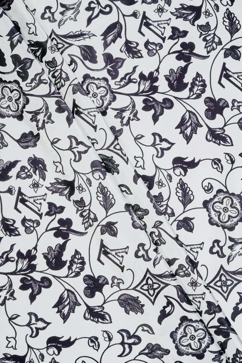 Italian silk satin with elastane in silver grey with black patterns. The motif is quite dense and consists of black twigs with leaves and patterns and logos of the well-known Fashion House. The fabric is thin, opaque, lightweight, airy and elastic. An interesting proposition for fans of branded fabrics in the best quality. It will be perfect for dresses, blouses, shirts or kimonos.