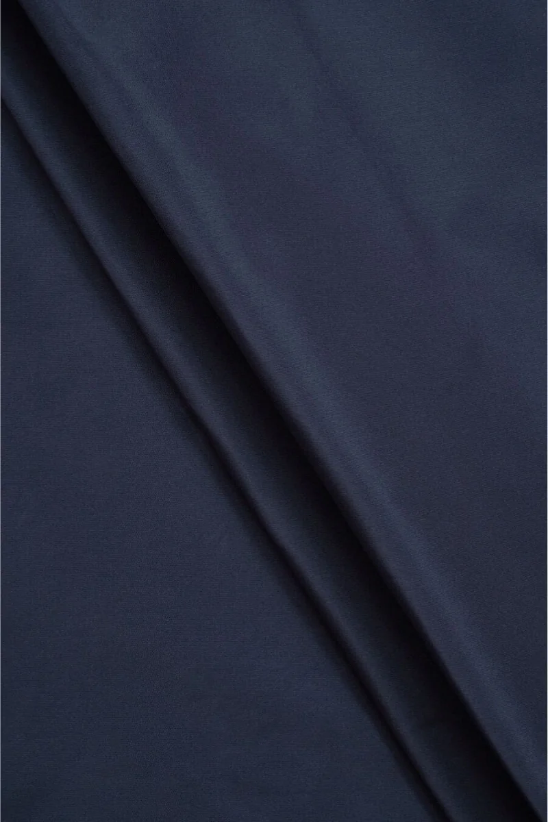 Italian 100% silk shandong fabric in navy blue. The fabric is smoother with slight thickenings. It is opaque, inelastic, rather stiff and very elegant. It is perfect for evening dresses, skirts, blouses and jackets.