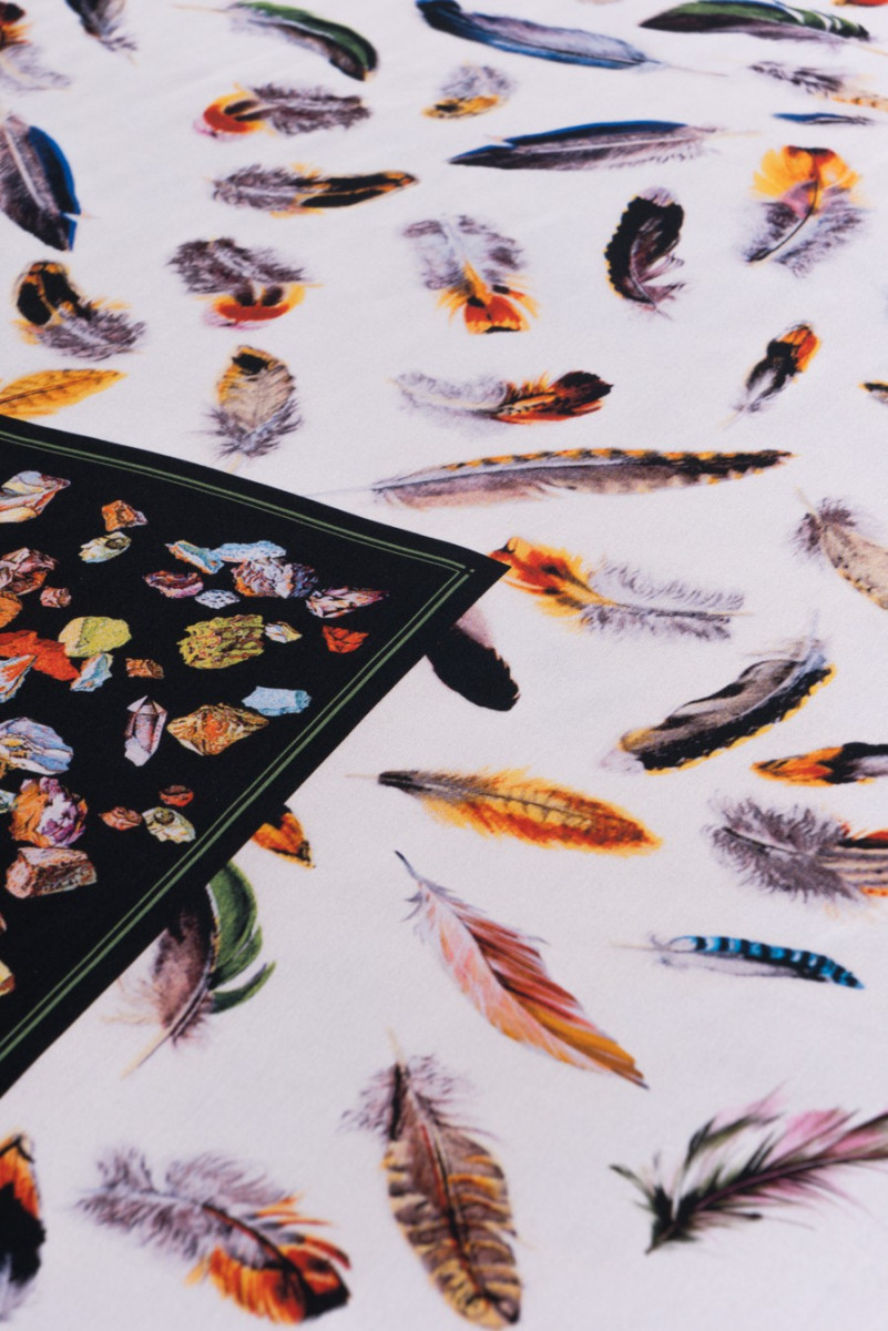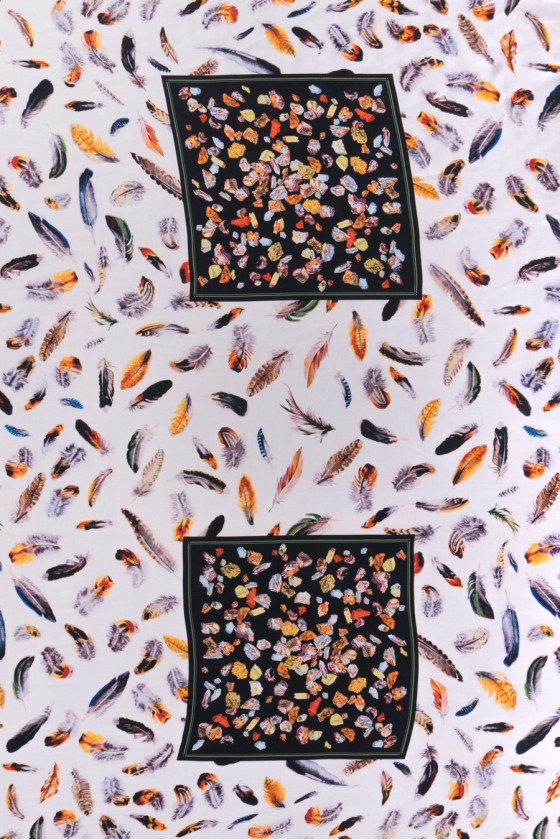 Airy, thick muslin made of natural silk woven in repetitive patterns - coupons with a size of 140*70 cm. The coupon consists of 2 black squares with precious stone prints in the middle with sides of 32 cm * 32 cm. The squares are surrounded by colourful feathers on an écru background.