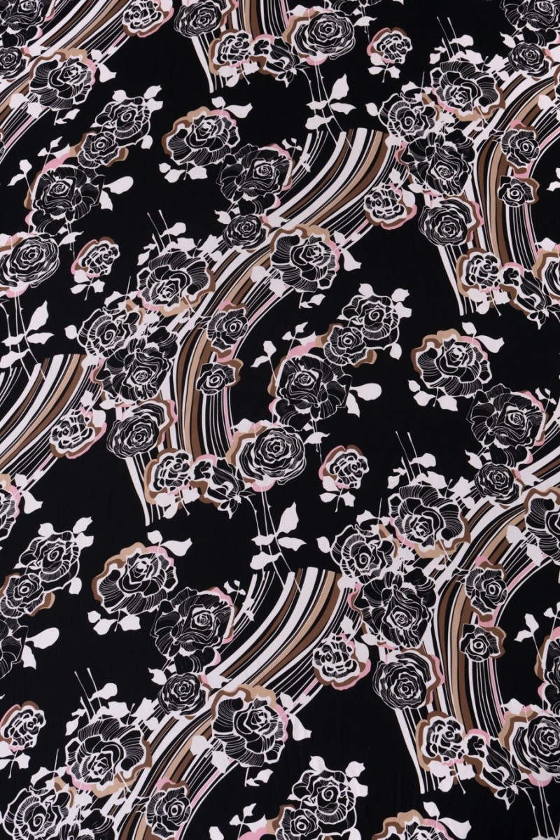 Italian 100% silk satin in black with a dense print of rose flowers in white, beige and light pink. The whole is complemented by wide, wavy stripes in the same color. A fantastic proposition for people who like floral patterns in dark colors.