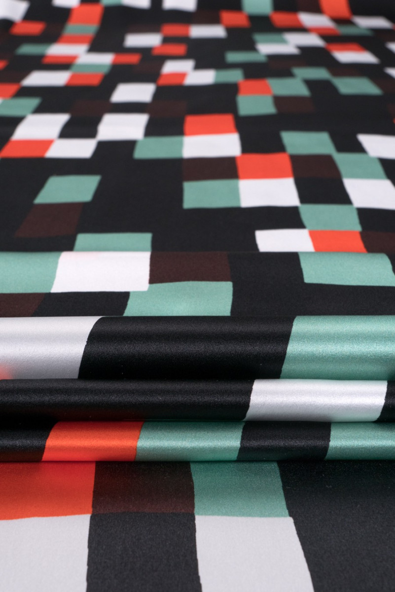 Beautiful satin patterned with natural silk of a well-known fashion designer. colors: on a black background colored rectangles (white, mint and orange)
