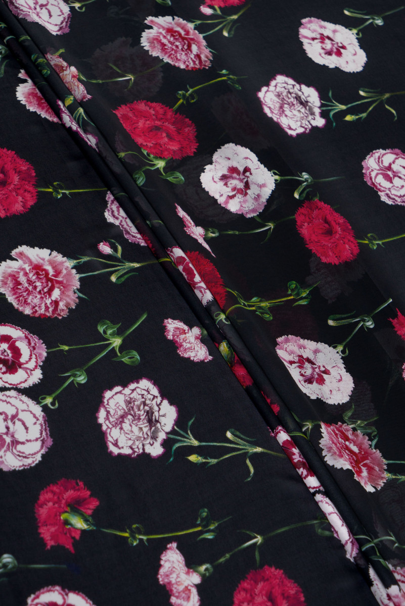 Natural silk chiffon is a very delicate, airy, transparent fabric. Perfect for airy dresses and blouses. Inelastic fabric. N black carnation background..