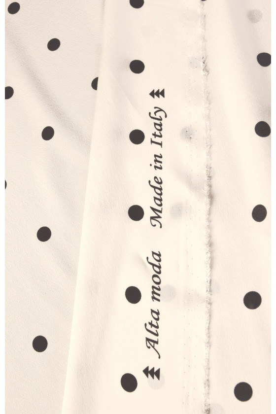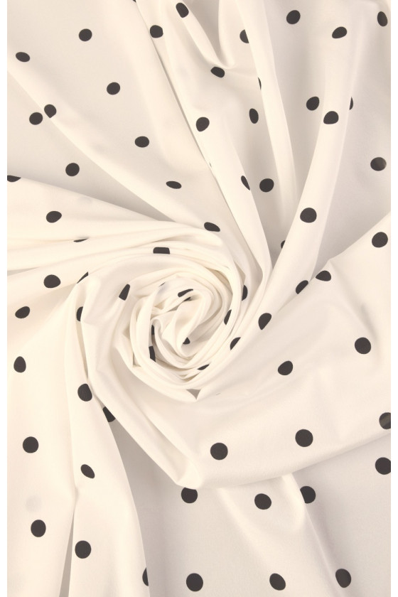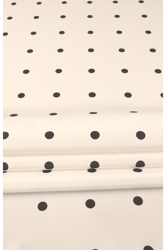 Silk crepe in peas is a delicate fabric, thin but semi-opacity, with a slight sheen. From it you can conjure up airy dresses, delicate blouses, scarves, scarves. We recommend that you choose the lining. Colors: on ecru black peas.
