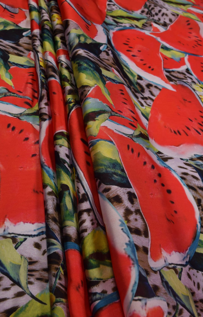 Polyester satin with watermelons, thinner, airy, pleasant to the touch, matte. We recommend sewing summer dresses, blouses and skirts from it. It is slightly transparent, so we recommend using a lining. Very good quality fabric. The grammage is also suitable for sewing women's shirts. Colors: red, green, brown, gray. A watermelon pattern about 12 cm in size.