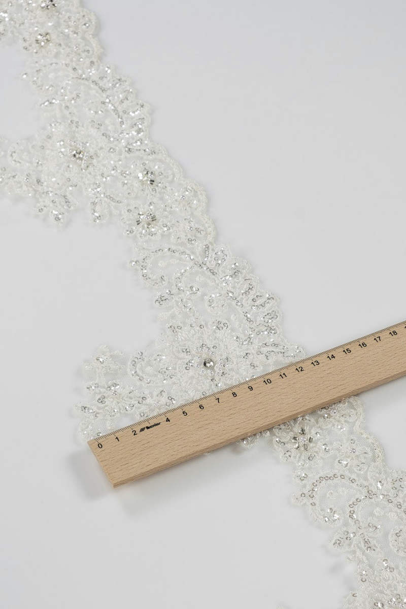 Italian lace tape in white one-sided finished with a tooth. Floral motif richly embroidered with beads and sequins of white and silver color. Ideal for finishing wedding and evening fabrics.