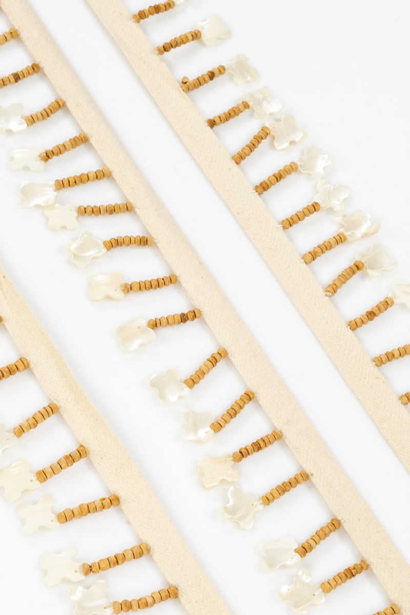 Italian pasmanteri strip in beige. For cotton ribbon in light beige color, tassels of wooden beads were sewn (every 2 cm), finished with a cross of mother-of-pearl.