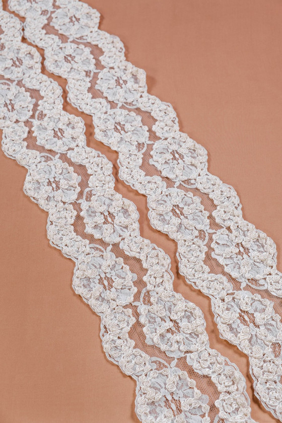 Italian pasmanteral tape - lace with a width of 13 cm. Floral motif decorated with a string in the form of "augers" of cream color. Tape on both sides finished with a tooth.