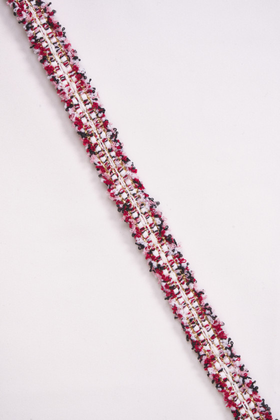 Italian chanel haberdashery tape multicolor 1.5 cm wide. The tape is made in the predominant colors: pink, cream, red and black, all delicately decorated with gold lurex thread. Ideal for finishing chanel fabrics.