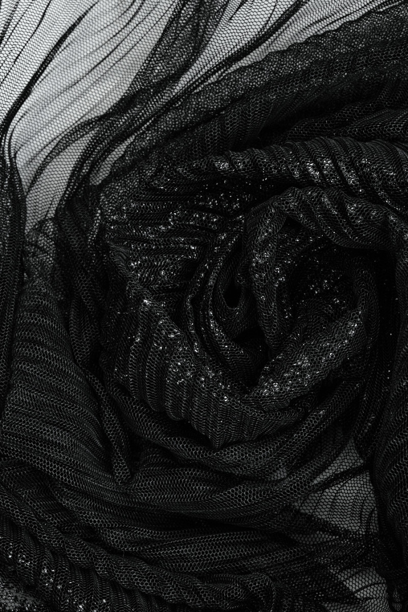 Decorative tulle with fine pleating in black. On both edges of the fabric there is a black, shiny foil, which reduces its density, turning into tiny spots that end at a height of 49 cm. The fabric is transparent, elastic, light, slightly stiff in places where there is foil. An interesting proposition from which you can create a formal outfit, such as a dress or skirt.