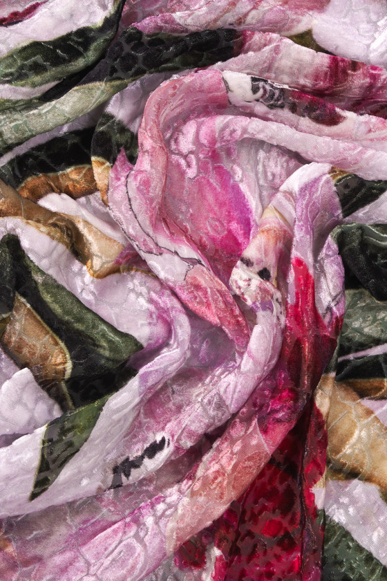 Italian viscose-silk velour devore with large, pink and red flowers on a light pink background - the pattern is circumferential. The devory fabric is a combination of smooth, transparent silk chiffon with opaque, velour viscose patterns.