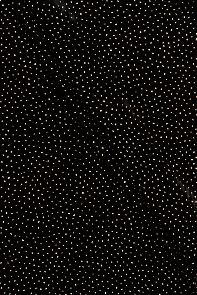 Italian, exclusive velour in black decorated with fine gold glitter. The fabric is soft, flowing, non-elastic, thin but opaque. It drapes beautifully and the glitter decoration adds a unique look to the fabric. A wonderful proposition for creating a formal dress, skirt or blouse. Glitter dots fall off slightly, we recommend pre-shrinking.