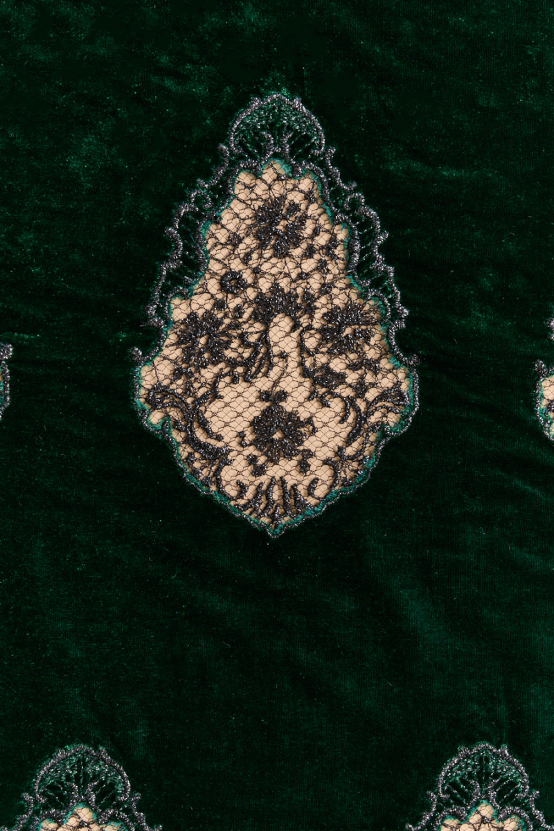 Italian, exclusive velour in bottle green decorated with black lace with shiny thread. The fabric is soft, flowing, inflexible, thin but opaque. It drapes beautifully, and the embroidered decorations arranged in two rows give the fabric a unique and unique look. Lace elements 17 cm high and 11 cm wide are repeated every 15 cm - the fabric is sewn circumferentially. A wonderful proposition to create an elegant dress, skirt or blouse.
