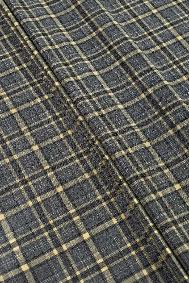 Italian costume wool with an admixture of polyester with a checkered motif in shades of gray and yellow. Inelastic fabric of medium thickness of autumn-winter species. Perfect for sewing a costume, dress, skirt, trousers or suit.