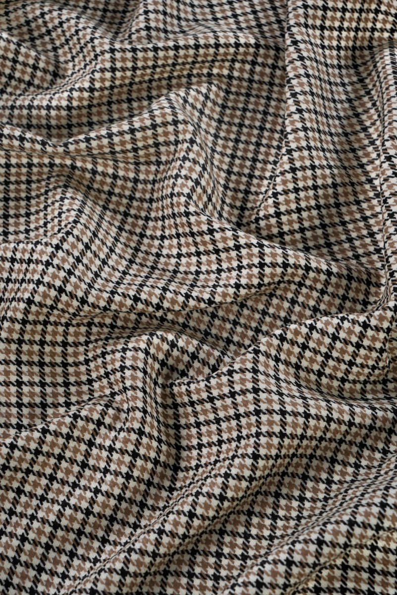 Italian costume wool in light beige color with a fine motif of check and pepitka (2 cm) in dark brown and camel. The fabric is thicker, inflexible, fleshy of the autumn-winter species. Perfect for sewing a costume, dress, skirt or jacket.