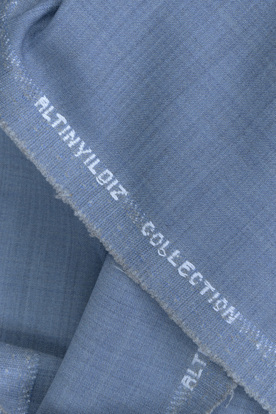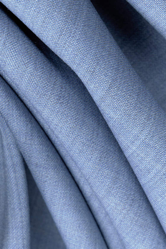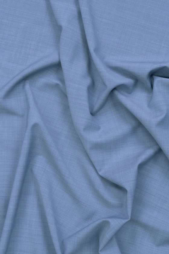 Italian costume fabric woven from two colors of threads: blue and gray, made of polyester and wool with the addition of elastane. The fabric is thin but opaque, elastic, has a smooth surface and a dense weave. Perfect for sewing a costume, pants, skirt, dress.