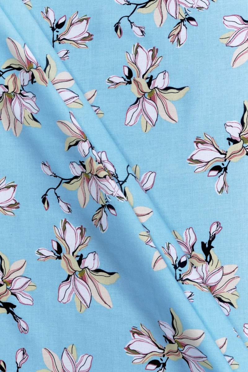 Italian 100% viscose fabric in blue color with a dense floral motif. The flowers range in size from 10 cm to 15 cm and are kept in ecru, beige, black with burgundy borders. The fabric is thin, inelastic with a plain weave. A very subtle proposition for sewing a summer dress, blouse or skirt.