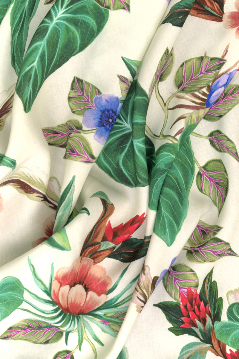 Italian 100% viscose fabric in light beige with a dense motif of exotic flowers and leaves. The print was made in green and fuchsia colors. cornflower and beige and red. The fabric is soft and opaque with a plain weave, very pleasant to the touch. This species is perfect for hot summer days.