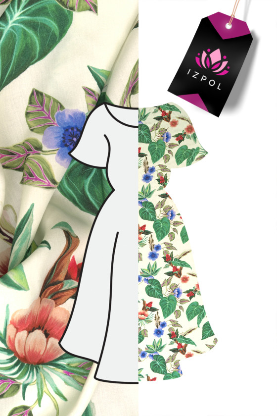 Italian fabric 100% viscose in light beige color with a dense motif of exotic flowers and leaves. The print was made in the colors of green, fuchsia. cornflower and beige and red. The fabric is soft and opaque with a canvas weave, very pleasant to the touch. This species is perfect for summer, hot days.