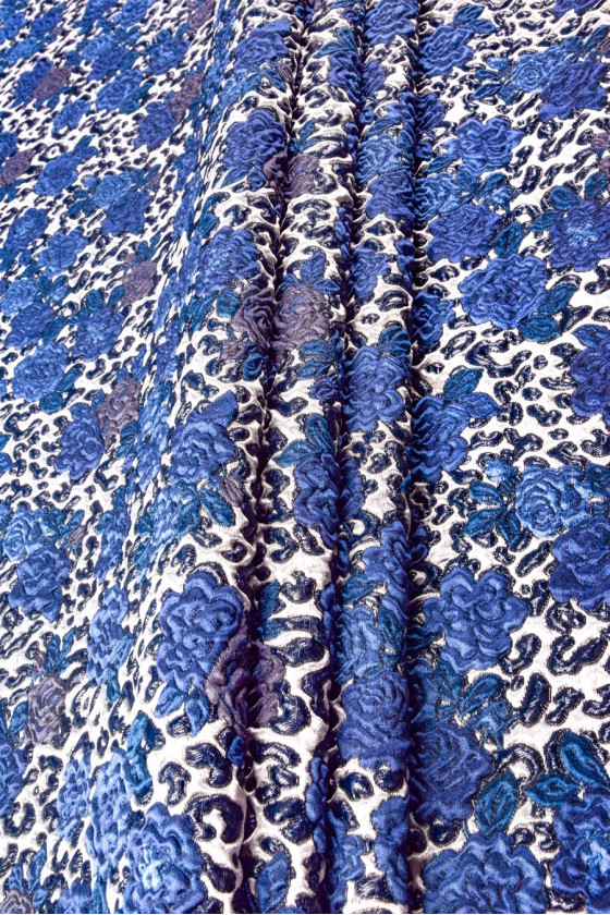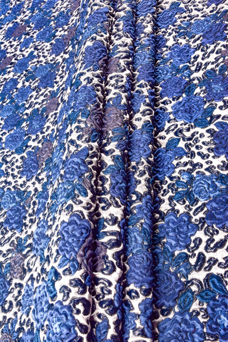 Italian jacquard costume fabric in a coupon with dimensions of 65cm x 140cm. A very striking, convex pattern of rose flowers in blue and navy blue. The whole is made on a light gray background and is decorated with a shiny thread, which gives the fabric elegance. coupon allows you to sew a narrow skirt or, for example, a pillow. It is also ideal as a base for combining with other fabrics.