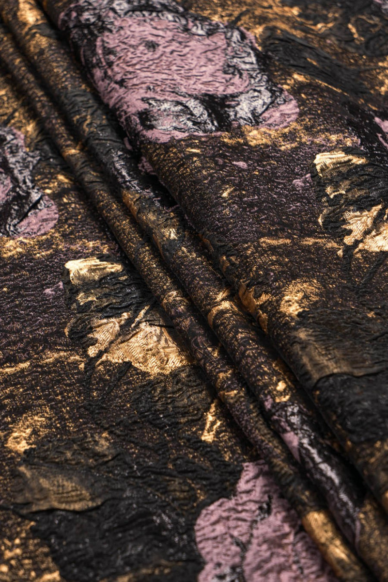 Italian jacquard costume fabric with a large rose flower motif (about 15cm). The background of the fabric is made in black and gold and looks as if a stiff mesh has been applied to the fabric. The floral motif is in dirty pink with a black twig and leaves, additionally decorated with a shiny black thread. It is slightly corrugated and convex. The material is very elegant with a noble composition, perfect for sewing a dress, skirt, costume, coat.