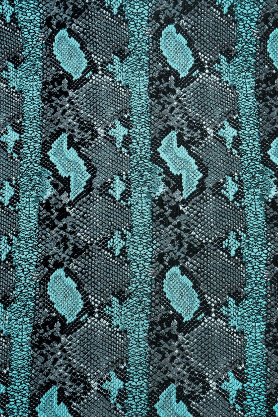 Italian jacquard costume fabric with a snakeskin motif. The whole is kept in black and gray colors and turquoise. The fabric has a slightly convex structure, is inelastic and slightly stiff. A great proposition for fans of animal motifs, but in original colors. It is perfect for sewing a fancy suit, jacket or coat.