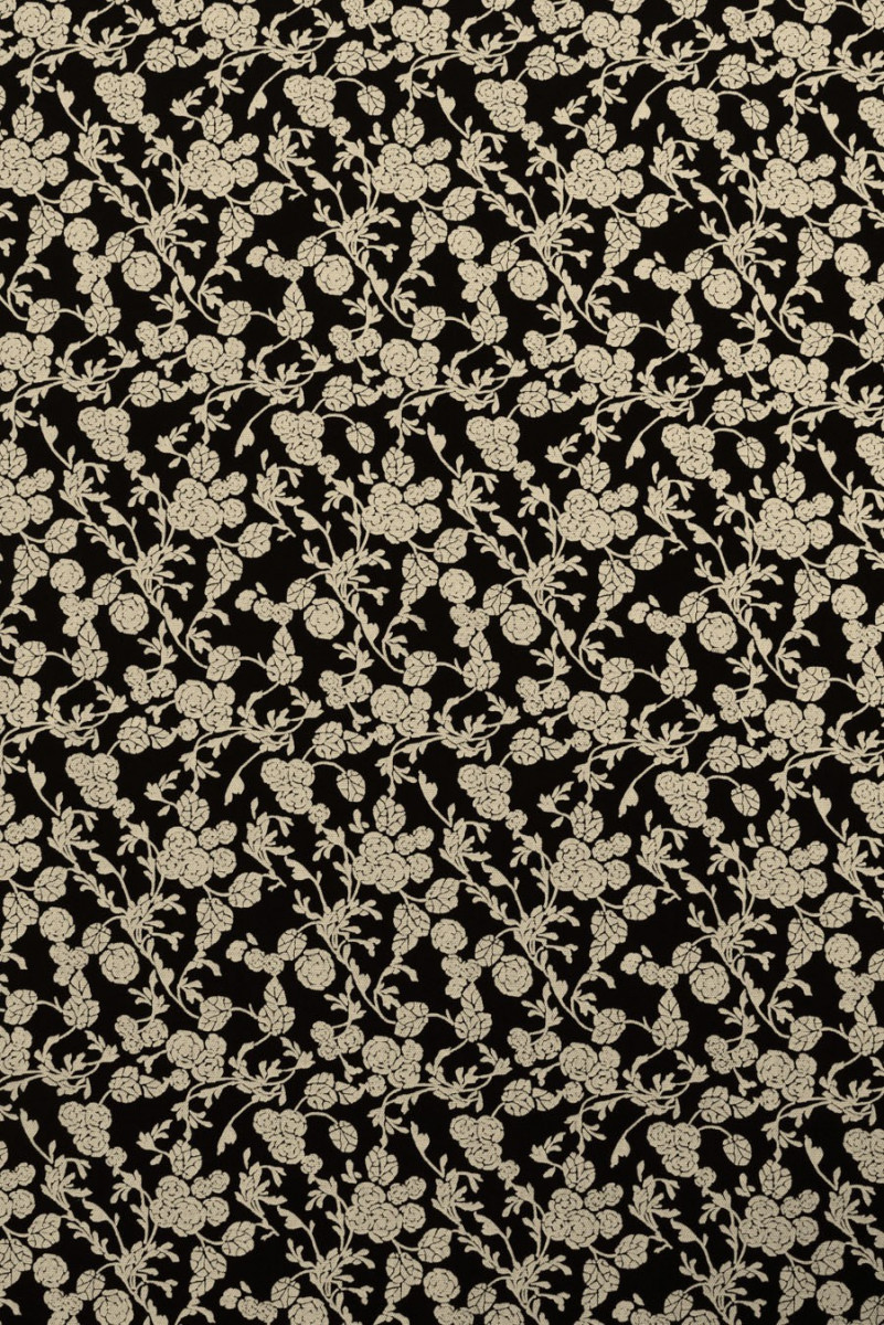 Viscose jacquard in black with écru floral print. Medium thickness fabric, tightly woven, slightly rigid.