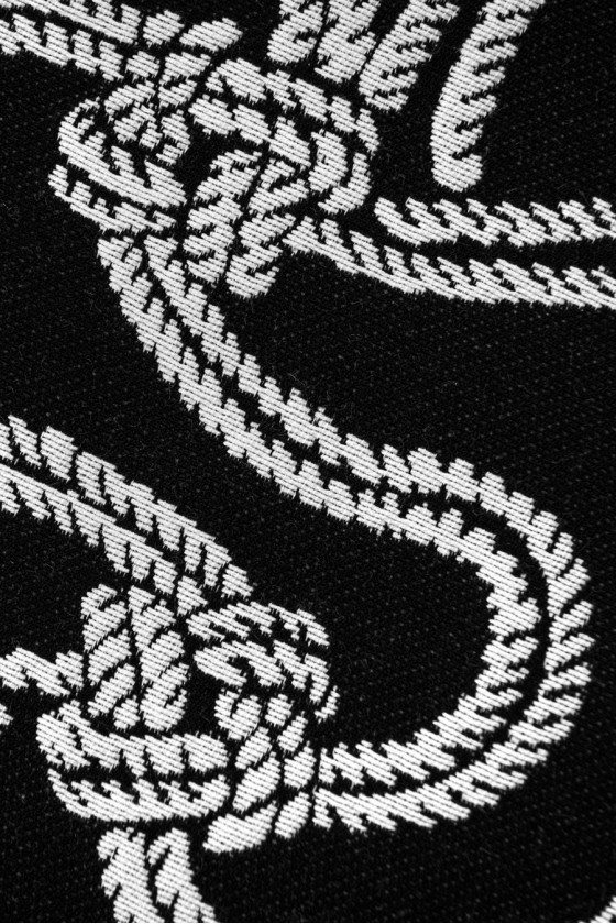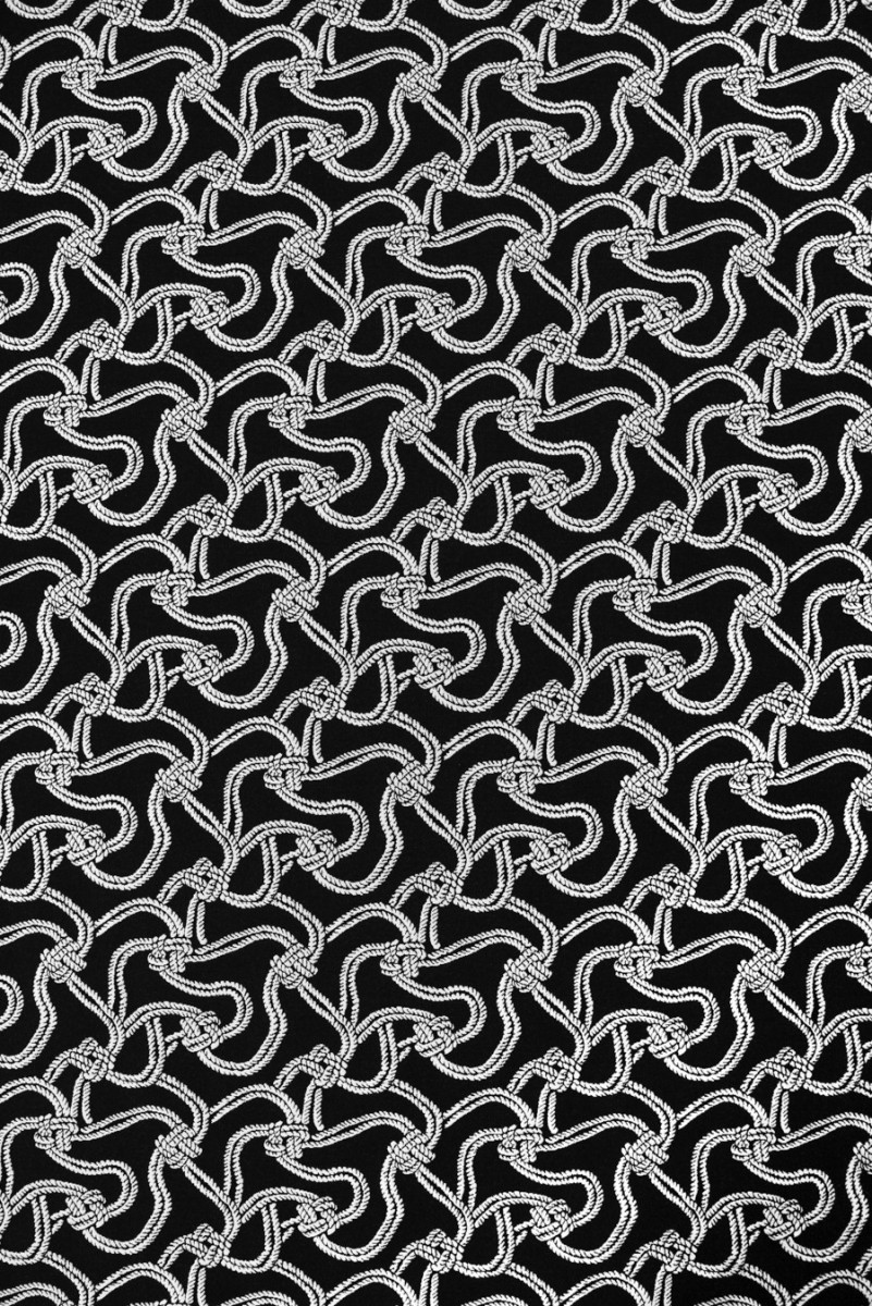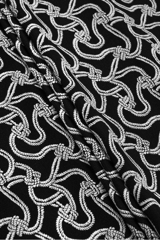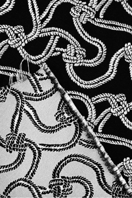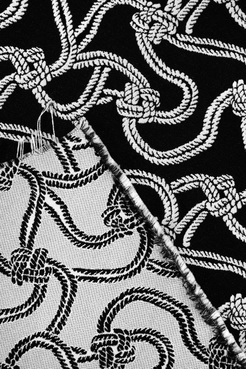 Italian jacquard costume fabric. A very interesting, dense pattern of white cords with knots on a black background, the left side has the opposite color - black cords on a white background and can also be used for sewing. The fabric is non-elastic, medium-thick with a matte weave - it resembles jeans. It is perfect for sewing a skirt, jacket or dress.
