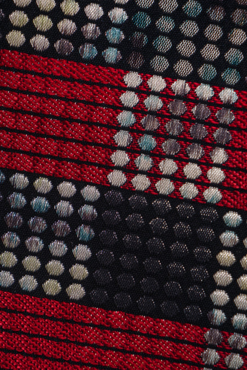 Italian jacquard costume fabric with a very interesting geometric motif. The pattern is made up of irregularly interwoven red and black stripes with embroidery in the form of small, shaded dots. The whole gives a very nice effect of a 3cm wide grid. The fabric is very original in a classic color combination. It is perfect for sewing a costume, skirt, dress or as a decorative fabric.