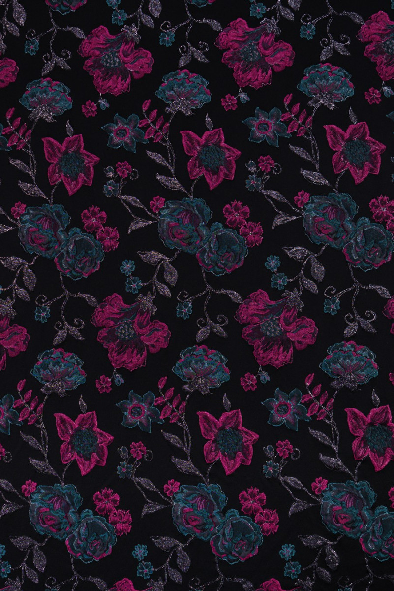 Italian jacquard costume fabric with a dense floral motif. The background of the fabric is made in black with a dense gray pattern with fuchsia and turquoise flowers, the whole is decorated with a silver, shiny thread. The fabric is non-elastic and slightly stiff, perfect for sewing an elegant suit, dress or costume.