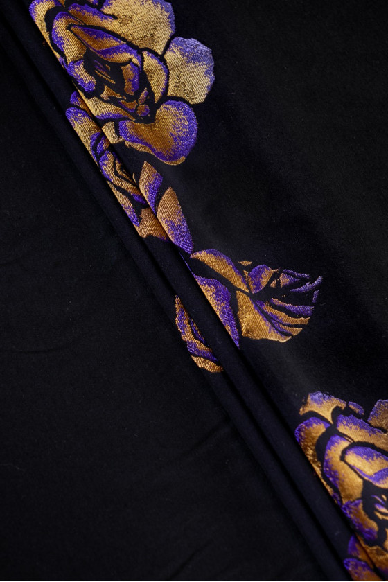 Italian jacquard fabric with a glossy, gold-purple floral motif on a black background. The fabric comes in a 120 cm* 150 cm coupon.