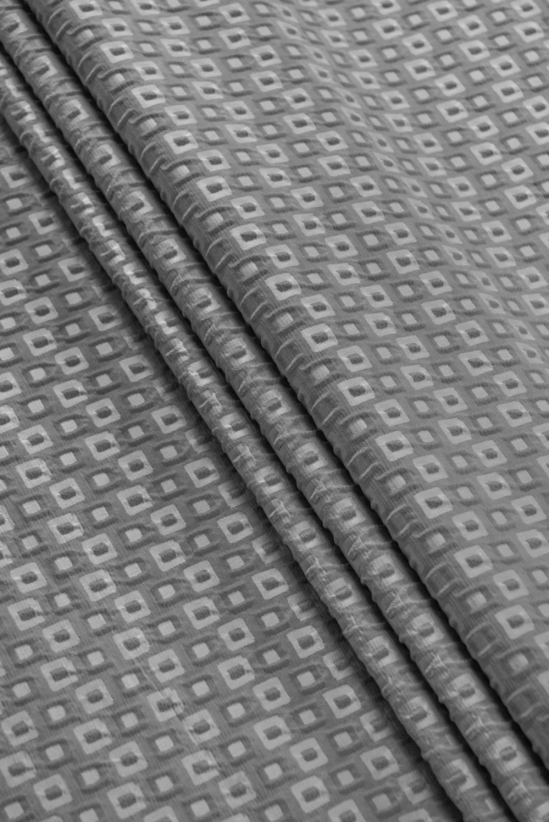 Jacquard in gray woven into a small geometric pattern of lighter squares. The method of weaving creates a notching of the fabric, which gives a 3D effect.