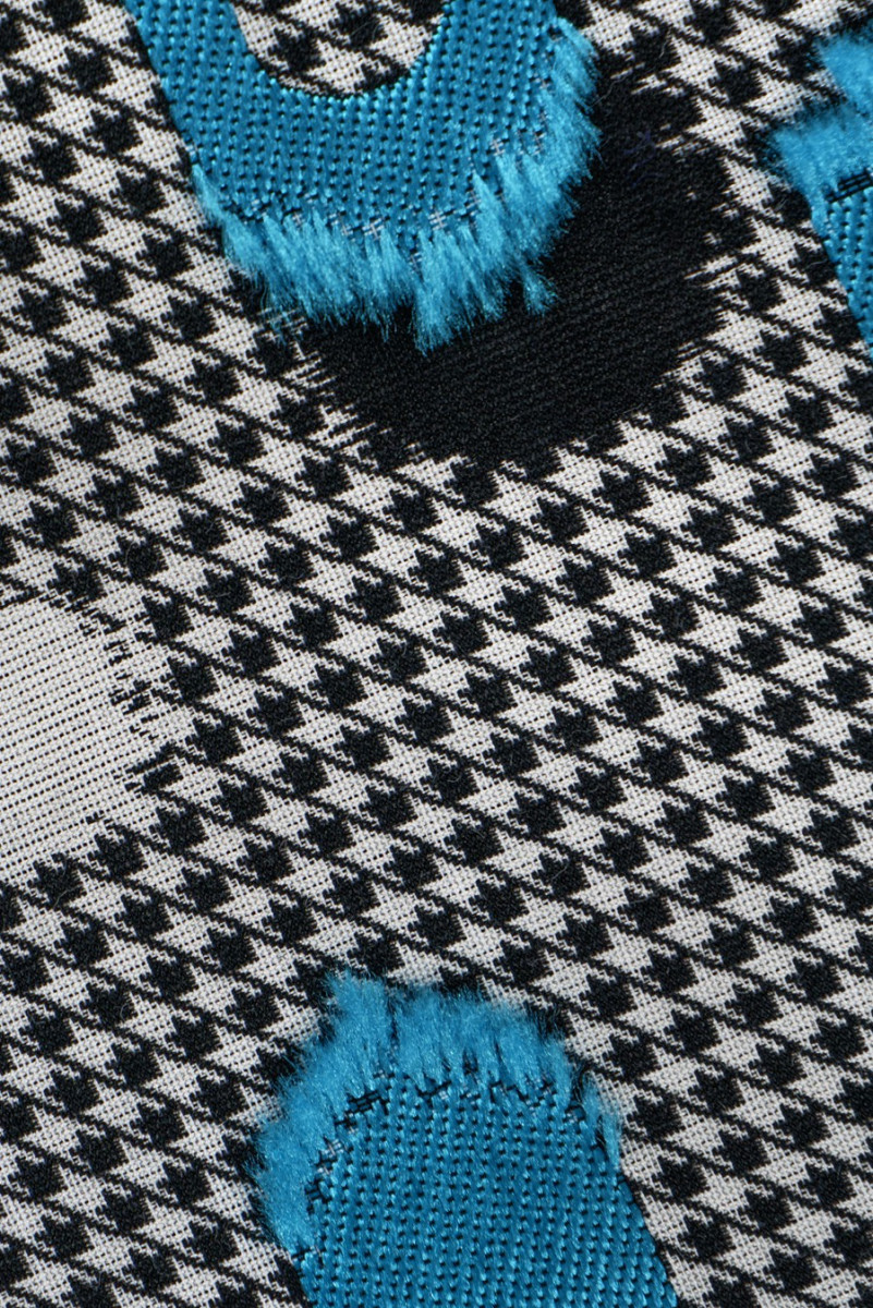 Italian jacquard costume fabric. A motif of a small, white and gray chicken foot with irregular polka dots (1.5 cm - 4 cm) in black, gray and turquoise.