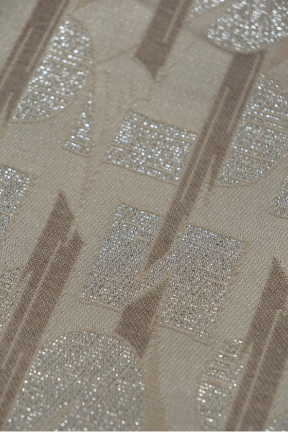 Italian jacquard costume fabric, beige in geometric patterns, decorated with silver lurex thread. Fabric thicker, rigid, inflexible with a characteristic shine.