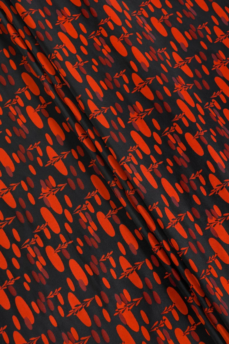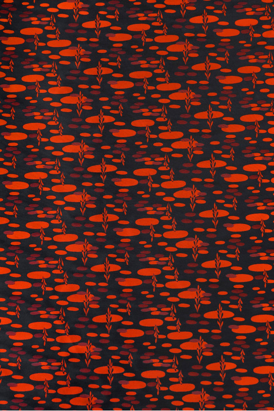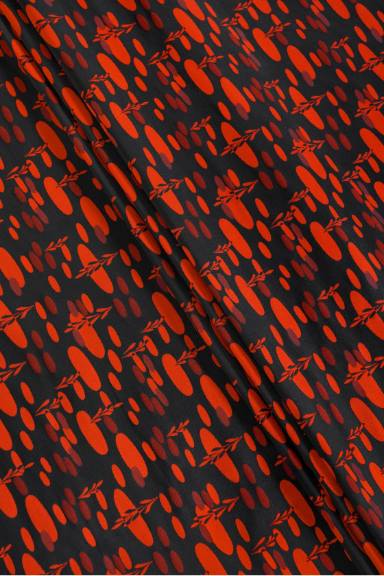 Italian costume fabric of jacquard type in dark navy blue color with a motif of orange dots and twigs - it can be sewn on both sides. Thicker, rigid, non-elastic fabric with a characteristic gloss. Perfect for sewing a dress, costume, skirt or for decorative purposes.