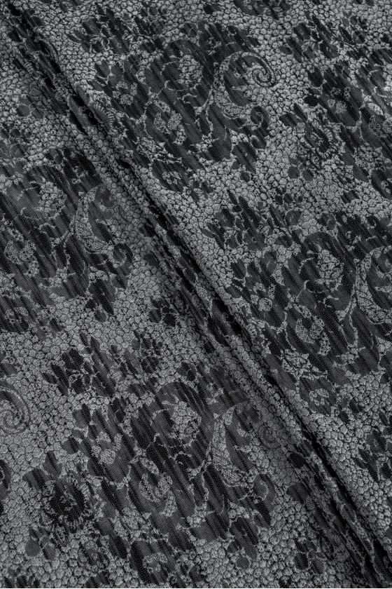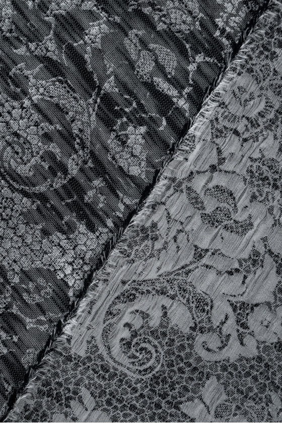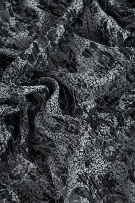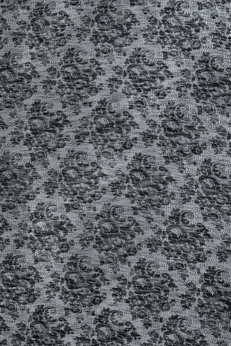 Italian jacquard costume fabric in black and silver with floral motifs. The background of the fabric is made in gray and silver and has a texture resembling a honeycomb. On it there are black floral motifs, clustered in round forms. The fabric is soft, thin with a loose weave, slightly transparent. Perfect for sewing a dress, blouse, skirt or for decorative purposes.