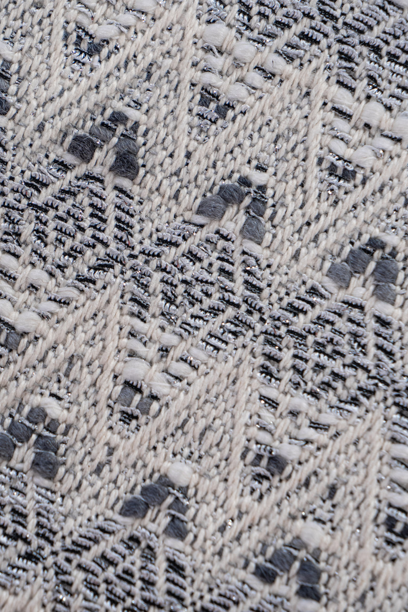 Italian jacquard costume fabric in gray and écru with the motif of small rhombuses arranged in horizontal stripes. The fabric is thicker, stiff, weave resembles chanel fabric.