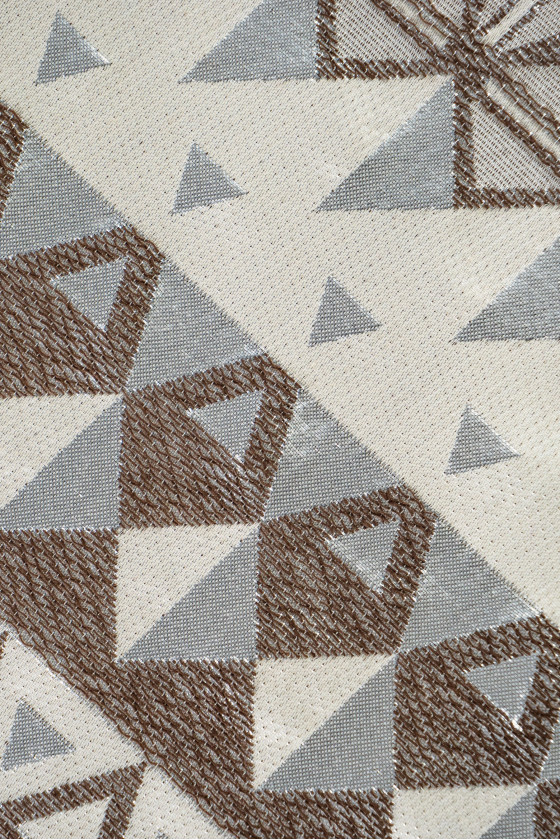 Italian jacquard costume fabric in small geometric patterns in beige-brown color, decorated with silver lurex thread. Fabric thinner, slightly stiff.