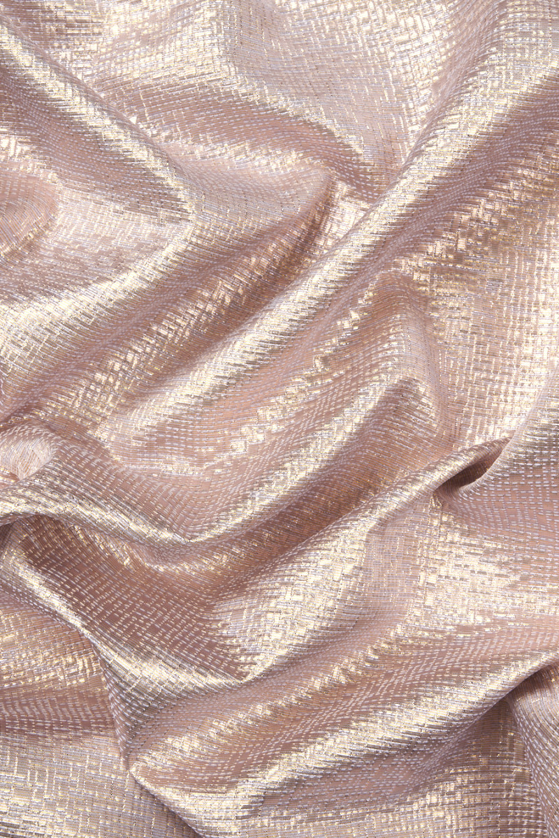 Italian jacquard costume fabric in lilac-gold color with a motif of a small, irregular grille. Fabric of medium thickness, inflexible with lurex thread.