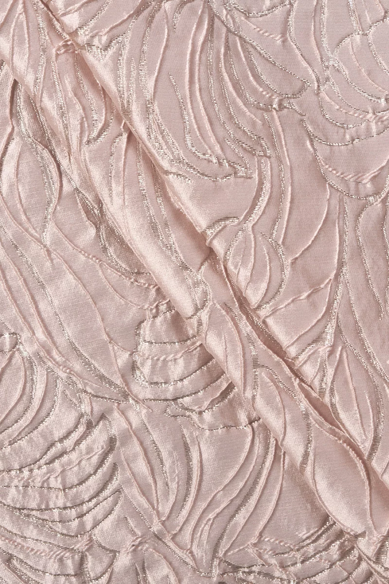 Italian jacquard costume fabric in powder-platinum color with a motif, large, slightly convex flowers. Fabric of medium thickness, inflexible, rigid.