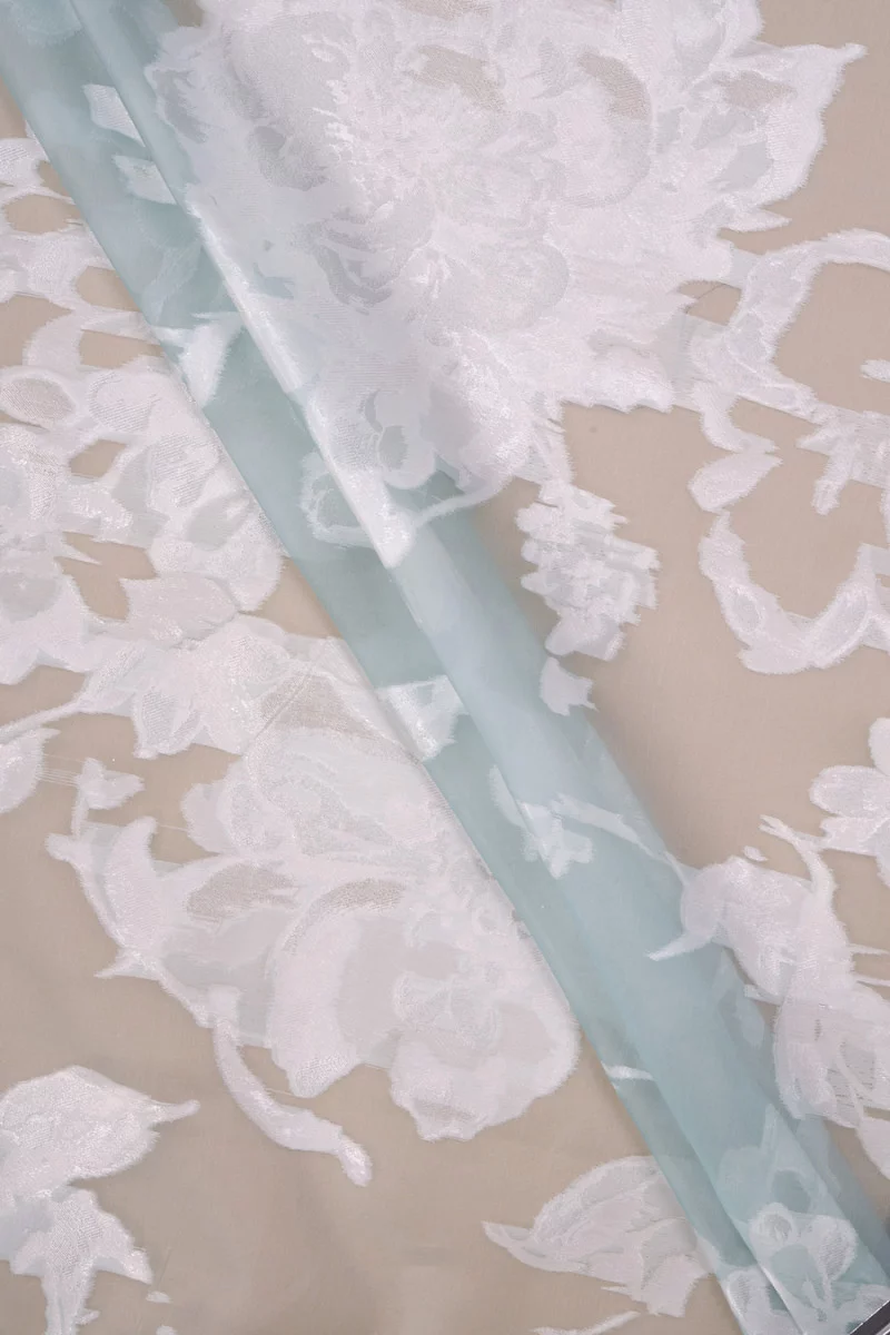 Italian organza fabric in mint color with a motif of cream-silver, jacquard flowers, decorated with shiny thread. The fabric is thin, transparent, inflexible, gently rigid. Perfect for sewing a dress or skirt.