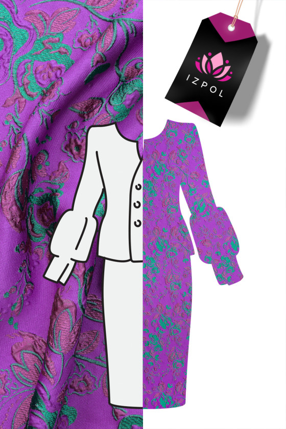 Italian jacquard costume fabric with densely woven flowers, medium size in green and pink, the pattern is slightly convex. The fabric is made in a fashionable fuchsia color, it is thin and soft, an interesting proposition for sewing a dress, skirt, jacket.