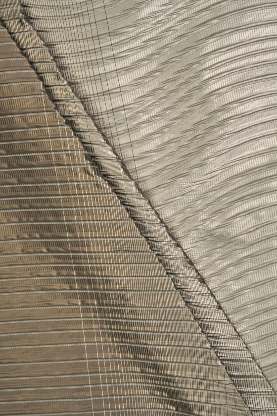 Italian jacquard fabric available in 115cm*133cm platinum gold plated coupons. The motif of stitching creating convex lines on one edge of the fabric in a darker beige color, which turn into waves on the other edge of the fabric in a lighter color. The width between the lines is 1 cm. The fabric is quite thin, but opaque, it fits like taffeta - slightly stiff and inelastic. A fantastic proposition in a calm yet elegant color for dresses, skirts, jackets.