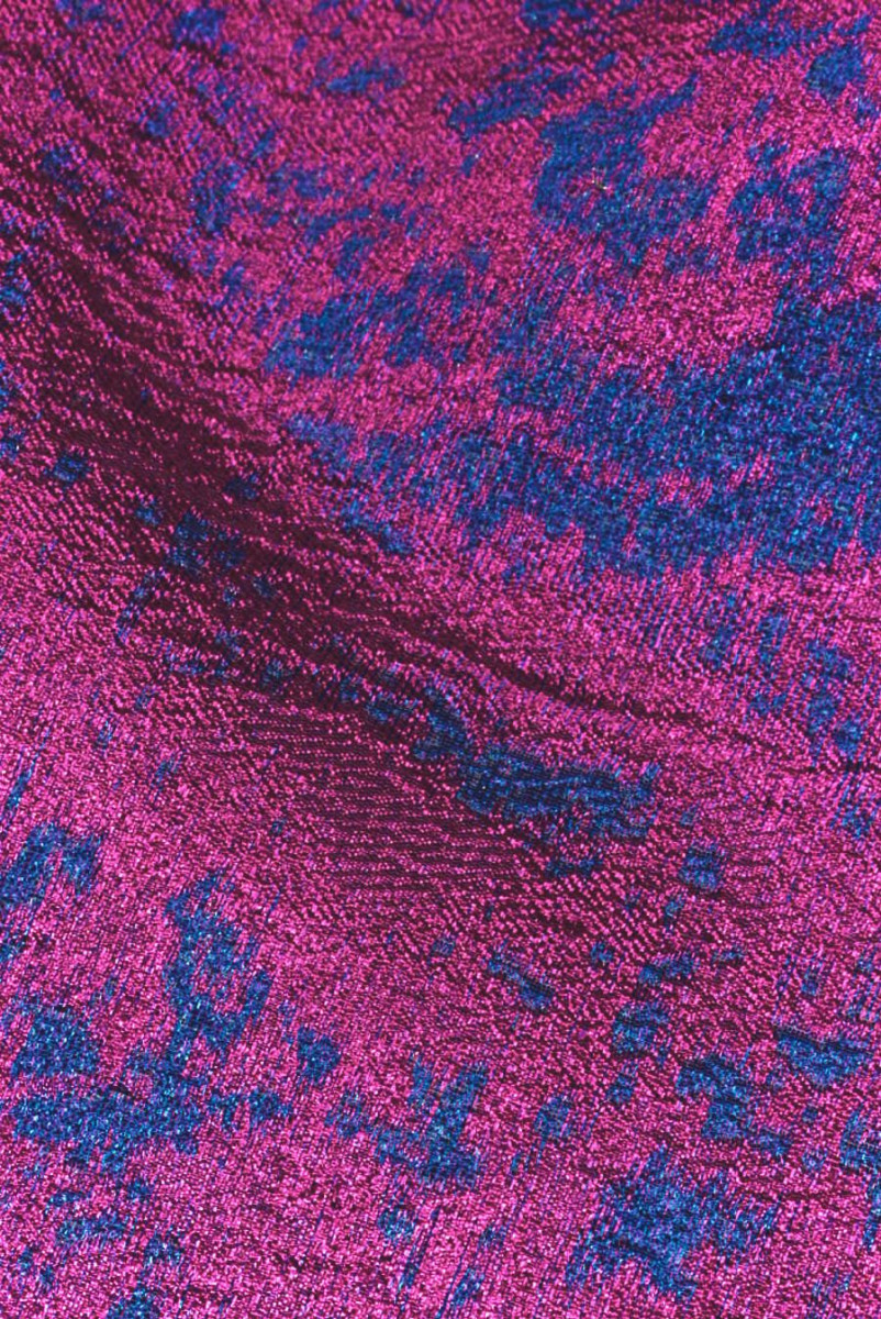 Jacquard fabric woven in an interesting, abstract pattern from two colors of threads: fuchsia and purple-blue. The irregular motifs are clear and quite large. The fabric is thin but opaque, inelastic, slightly stiff in arrangement, like taffeta, has a beautiful shine and a delicate, convex structure. A unique material perfect for evening outfits such as dresses, skirts or jackets. It will also work well as a decorative fabric.