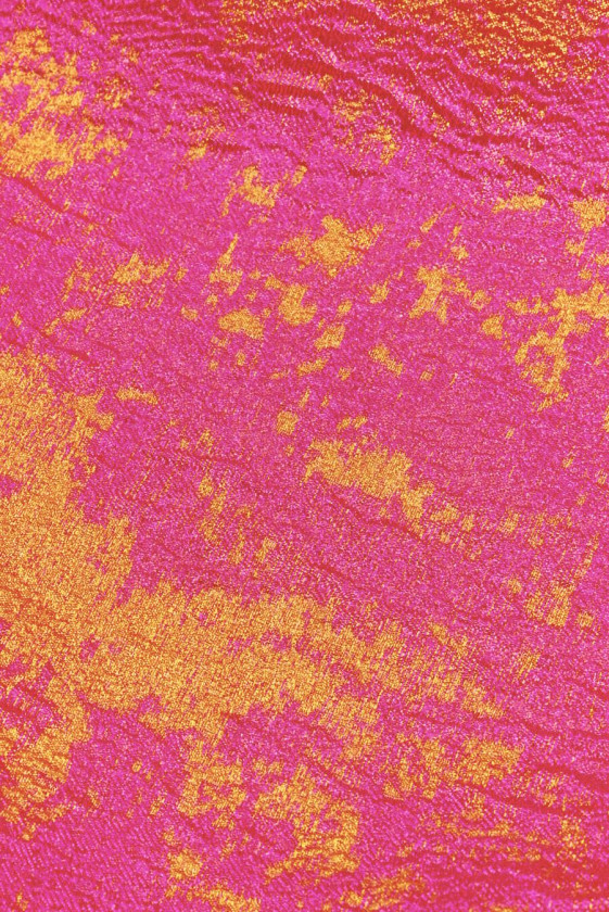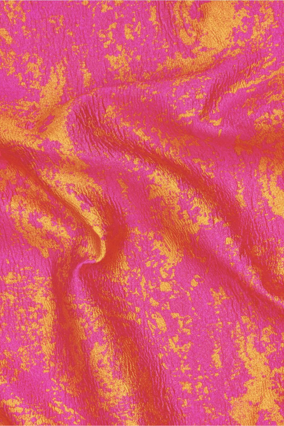 Jacquard fabric woven in an interesting, abstract pattern from two colors of threads: pink and orange. The irregular motifs are clear and quite large. The fabric is thin but opaque, inelastic, slightly stiff in arrangement, like taffeta, has a beautiful shine and a delicate, convex structure. A unique material perfect for evening outfits such as dresses, skirts or jackets. It will also work well as a decorative fabric.