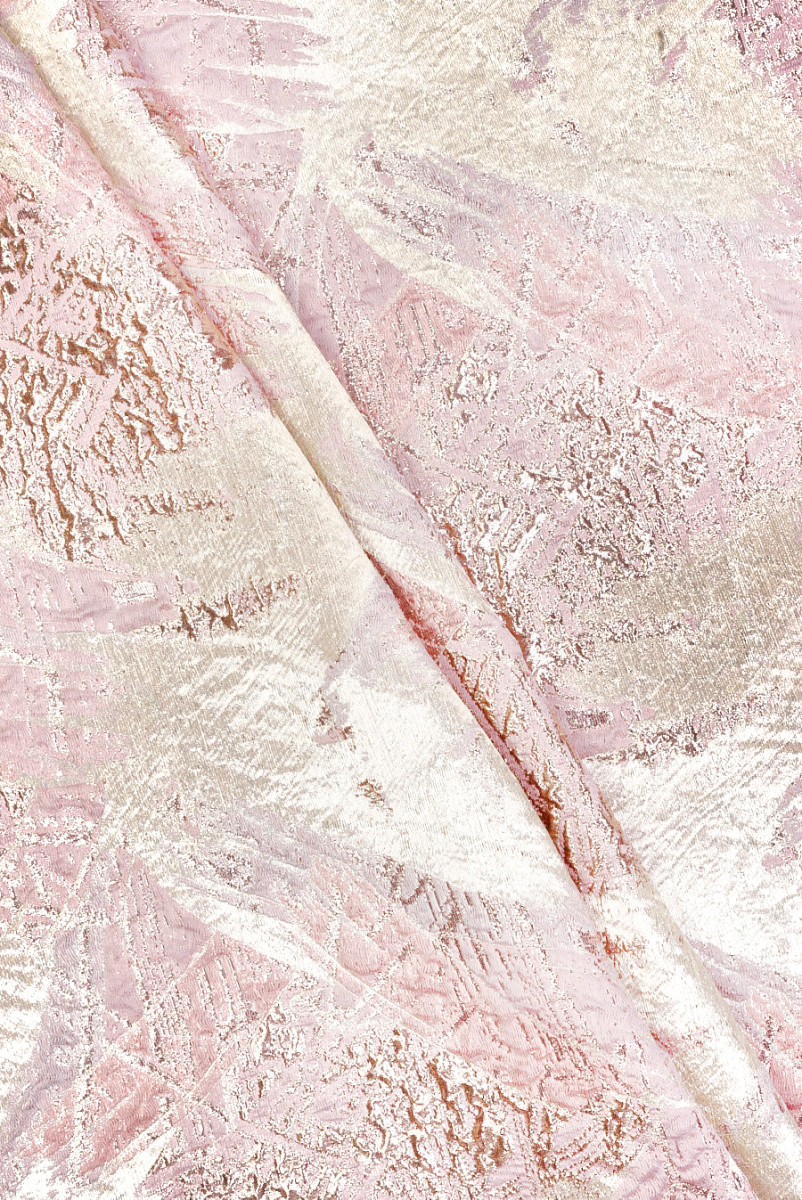 Polyester jacquard fabric with a motif of light pink and gold-pink elements on a light, pearl beige background. The pattern is quite large, dense and individual elements are repeated regularly. The fabric is inelastic, light, drapes rather stiffly, thin but opaque and shines wonderfully. An elegant proposition for people who like strong patterns in fresh colors. It is perfect for dresses, skirts, costumes and jackets.