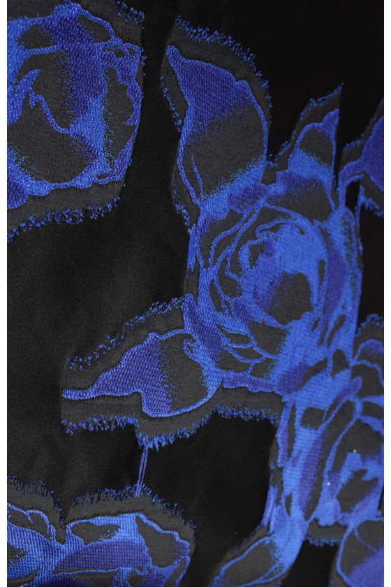 Italian jacquard costume fabric with a large floral motif. Material with a taffeta structure in black with embroidered, large patterns of flowers in blue - cornflower. The patterns on the edges are finished with fine tassels, which give the fabric a structured look. It is thin but stiff, very plastic. It is perfect for sewing an elegant dress, skirt or costume.